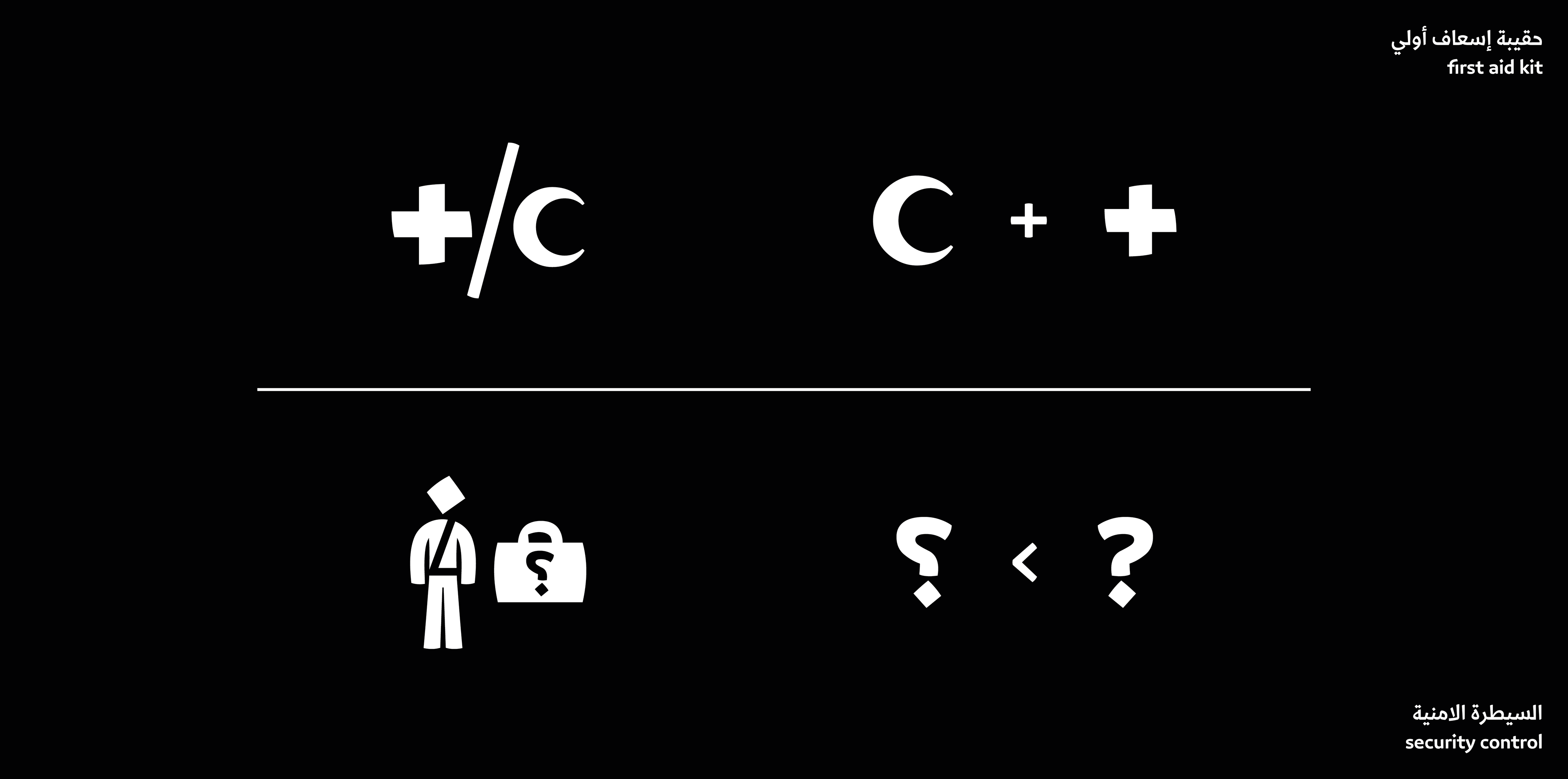 Během procesu tvorby jsem zkoumala a propojovala kulturní principy, jako jsou způsob čtení a používání symbolů. To zahrnovalo také otázku samotné orientace některých symbolů, například otazníku, který se v arabském jazyce píše zrcadlově. Další situací, kde byly symboly přizpůsobeny arabskému kontextu, je mimo jiné symbol pro první pomoc (kombinace kříže s půl měsíce — který je běžně využíván v islámské kultuře) či směnárnu.